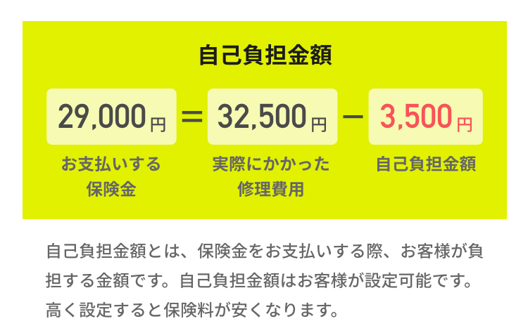自己負担金額は、保険期間中初回の保険金のお支払いについてはご契約申込時の自己負担金額と同額となります。保険期間中2回目以降の保険金のお支払いについては、保険金のお支払い回数に応じて3,500円ずつ増加します。