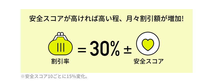 更新後の保険の保険料に割引が適用されます。割引率は、被保険者の保険の対象の取り扱いに応じて当社が計算する安全スコアに応じて決まります。安全スコアが更新時まで変化しなかったとした場合の割引額は、随時確認することが可能です。